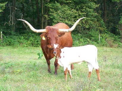 Hubbells Miss Gleam is one of my favorite cows. I can't fault her in any way, another genetic gold mine. She's a big cow with 56.5 inches tip to tip on 8/14/04 with a lot more total horn. Her 2003 bull calf, Hubbells Red Rock, by Overwhelming Icon is awesome. He has been sold to Terry Brown in Ohio. In 2004 Gleam had a heifer that is perfect just like her mother. Pictured above is Miss Gleam with her 2010 heifer calf out of JP Rio Grande.